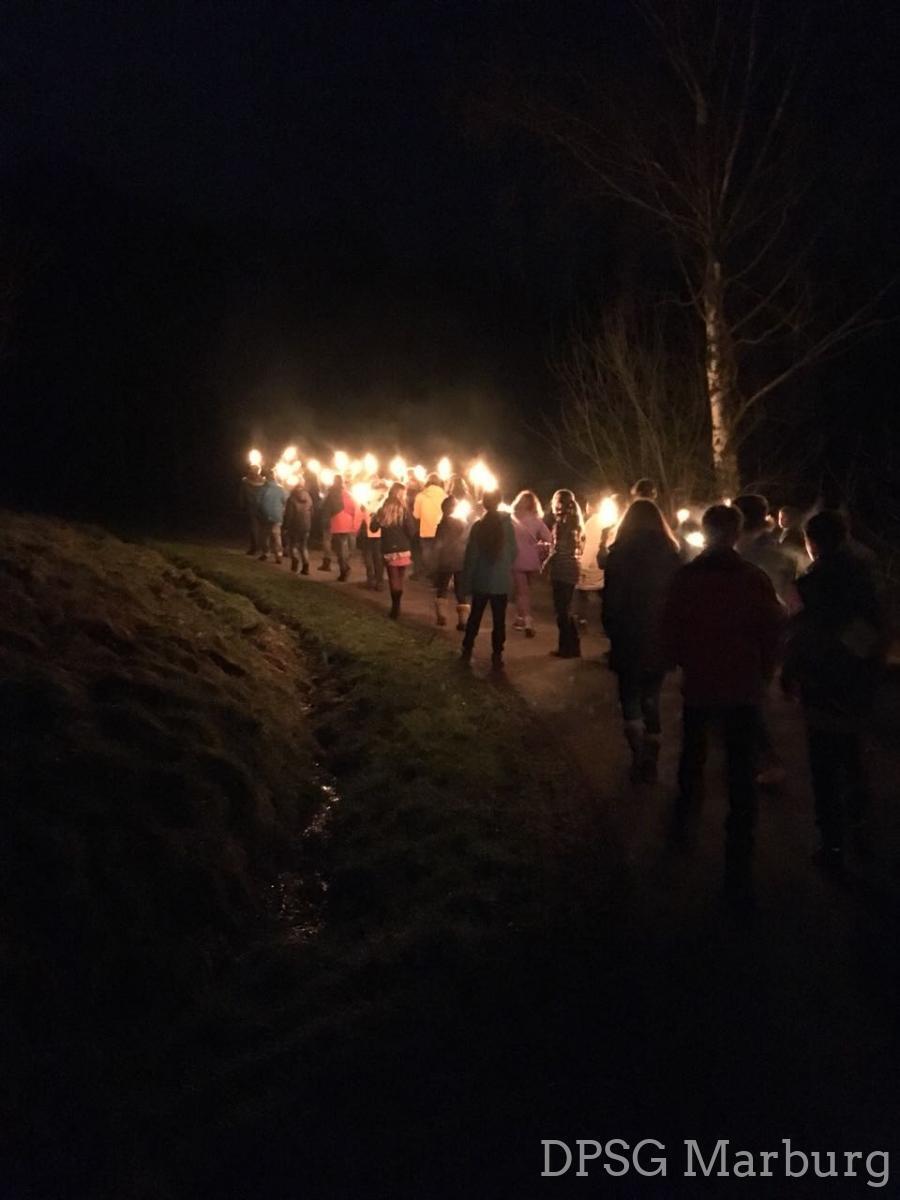 Mit Fackeln in der Hand starteten die rund 60 Teilnehmer des Wochenendes und wanderten hintereinander hinaus ins Dunkle – ein wirklich abenteuerlicher Spaziergang rund um das Haus in Röderhaid.