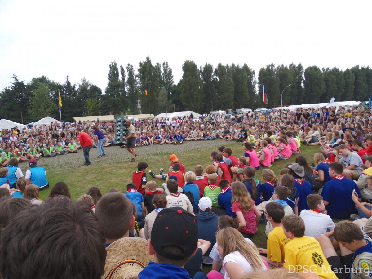 Der Samstag begann mit der Eröffnungszeremonie, bei der uns erst richtig klar wurde, wie viele Pfadfinder dreieinhalbtausend auf einen Haufen wirklich sind. Die unterschiedlichen Flaggen der teilnehmenden Nationen wurden gehisst und der Bürgermeister von Warendorf richtete ein paar warme Worte an die Versammelten.