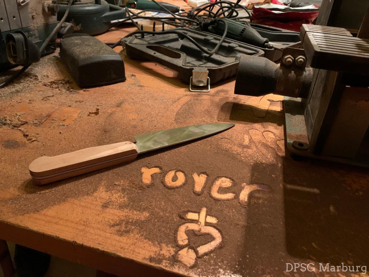 Seit einigen Wochen sind unsere Rover dabei ihre eigenen Messer zu gestalten. Jede Woche wird aufs Neue gesägt, geschmirgelt, geschliffen, geklebt, geölt und zu guter Letzt die Klinge geschärft. Alles mit viel Staub und Spaß. Wir sind gespannt auf die Ergebnisse!