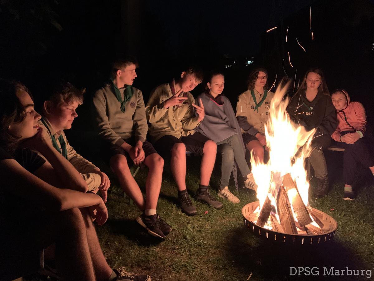 Die Stimmung war unbeschreiblich, als sich am Morgen des 16. August insgesamt 12 Pfadis und Rover mit ihren 7 Gruppenleitern am Bahnhof in Marburg trafen, um nach der Corona-Pause ins lang ersehnte Sommerlager zu fahren. Der Zielbahnhof in diesem Jahr war Weilburg an der Lahn. Dort angekommen ging es zu Fuß weiter zum Zeltplatz, welcher direkt an der Lahn und neben der Kirchhofsmühle gelegen war. Gerade rechtzeitig vor dem aufkommenden Regen wurden die Zelte aufgebaut und die Gruppen machten es sich für die nächsten 9 Tage gemütlich. Noch am ersten Abend wurden fünf der Pfadis aus ihren alten Gruppen verabschiedet und mit nagelneuen, roverroten Halstüchern herzlich in die Roverrunde des Stammes aufgenommen.