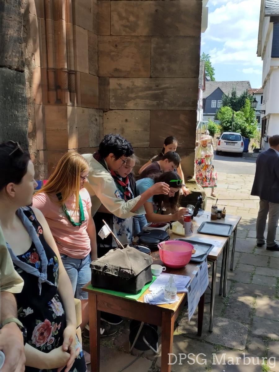 Am 11.06.23 haben sich fleißige Pfadis aus beiden unserer Pfadigruppen getroffen, um bei einem Waffelverkauf vor der Kugelkirche Spenden für unser Sommerlager zu sammeln.
